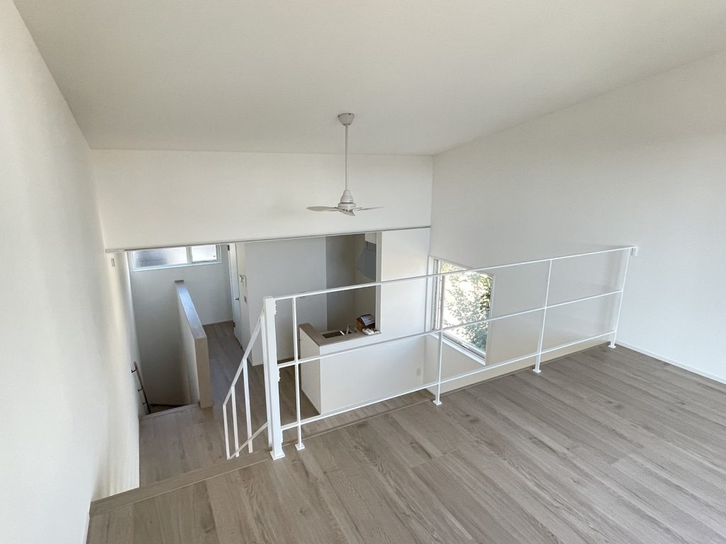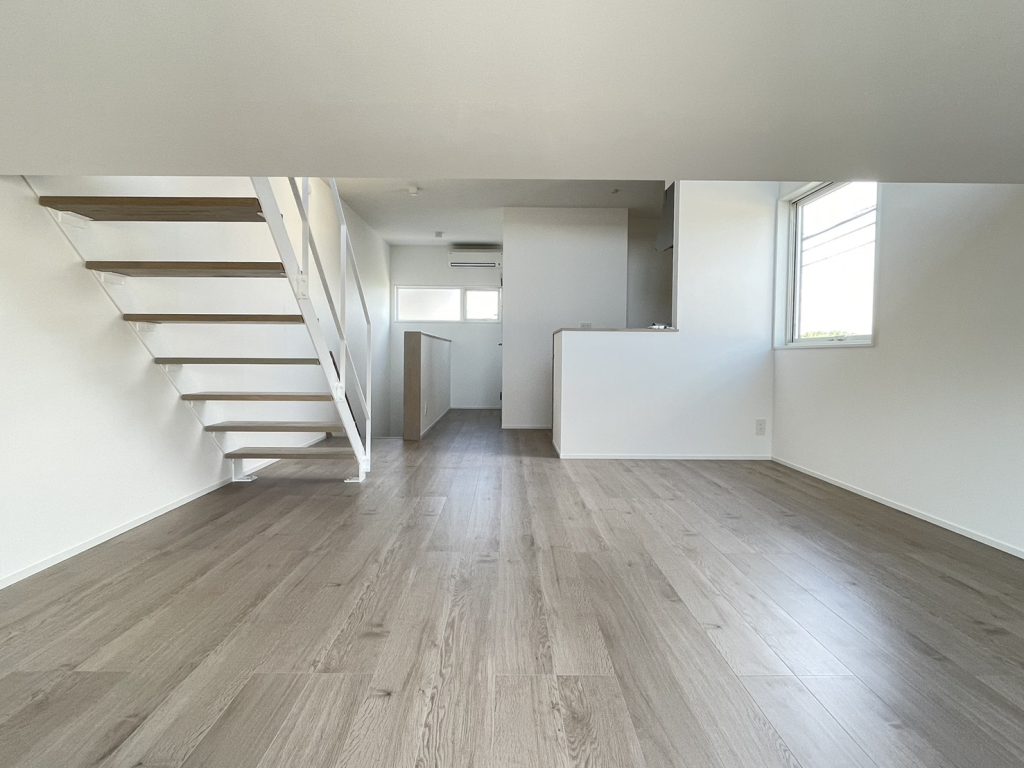 2階の居住スペースには、オープンキッチン、スキップフロアで中二階が設けられ、広々とした空間をお楽しみいただけます。デザインはシンプルかつ木材とスチールの素材感が特徴的で、洗練された雰囲気が漂います。