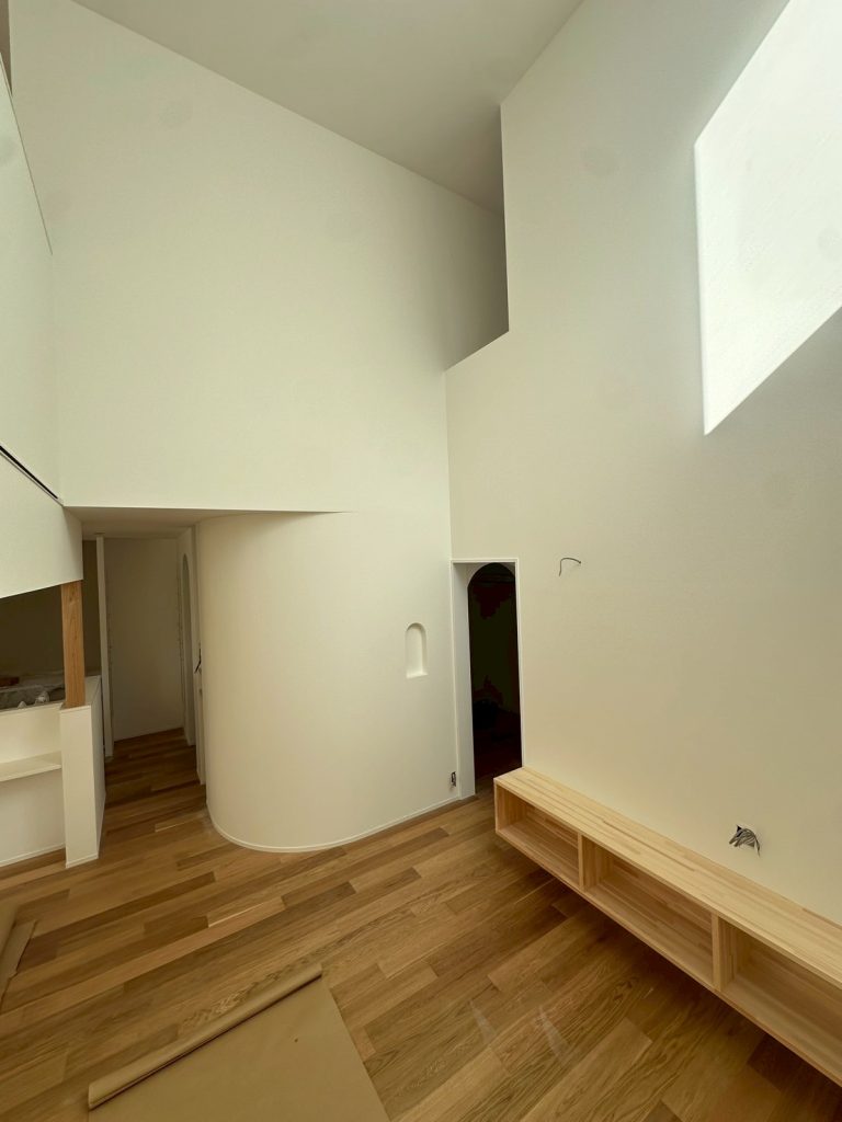 街に開かれた店舗と、柔らかなアーチが連続する住宅とで構成され、ふたつの空間がひとつの屋根の下で、ゆるやかにつながる。