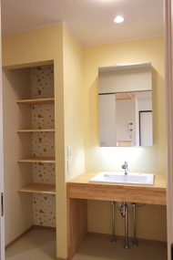 洗面脱衣室 施主支給品のミラーキャビネットを採用した造作洗面カウンター。 隣には可動棚で使い勝手のいい収納棚を配しました。