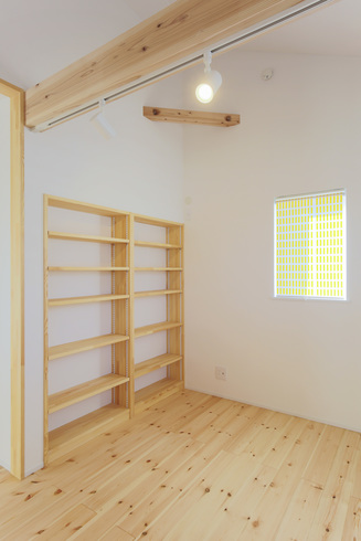造作棚 壁に埋め込んだパイン素材の本棚をつくりました。奥行235㎜のブックサイズ専用棚としてスッキリ見えます。