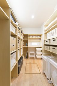 収納スペースたっぷりの、片付け上手になれる家です。それぞれのスペースを収納される「モノ」に合わせて設計。クローゼットは棚の数や大きさが計算されているので片付けが簡単ですし、大容量のパントリーは食品だけではなくお掃除用具やお薬、アイロン台などが収納できるようにデザインされています。また、家事動線も考慮して、リビングはぐるぐる回遊できるように設計。もちろん機能性以外にもこだわっており、和室の天井に曲線が施された造作の建具を設置するなど、洗練された空間を演出しています。お客様のこだわりである実用性とデザイン性の両立を実現しました。